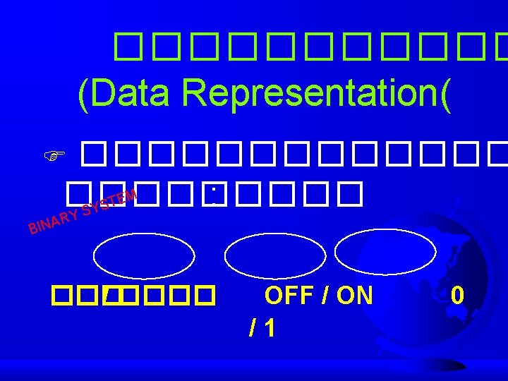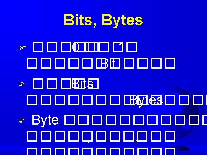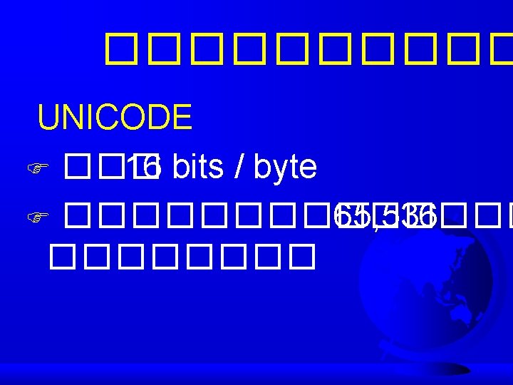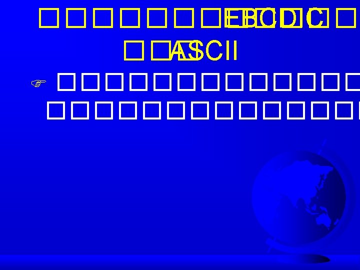 ���� Character 0000 011 0001 011 0010 011 011 0100 011 0101 011 EBCDIC 0000 1111 0001 1111 0010 1111 0011 1111 0100 1111 0101 1100 ASCII 0 1 2 3 4 5