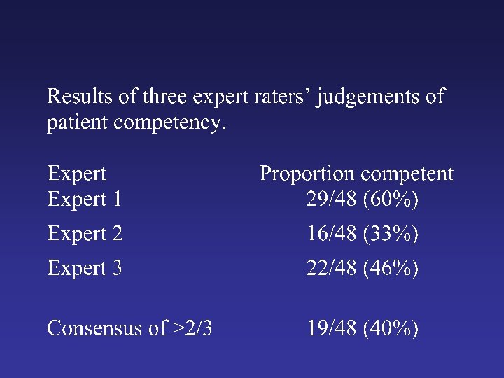 Relationship between overall cognition and competency Range of MMSE Proportion competent >24 10/14 (71%) 19 – 23 8/21 (38%) 12 – 18 1/13 (8%)