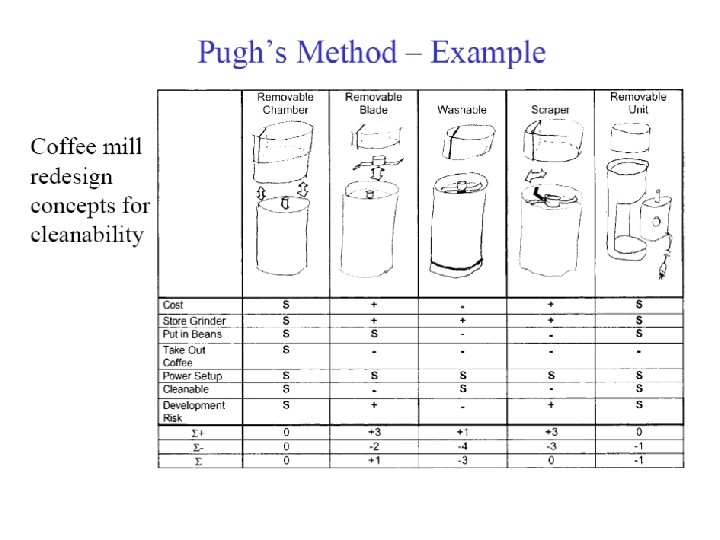 Design Selection –Pugh’s Method • Step 4 –Compute the total score Three scores are tallied, the number of plus scores, the number of minus scores and the total. If most designs get the same score on a certain criterion, examine that criterion closely. More knowledge may have to be developed in the area of the criterion.