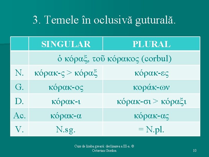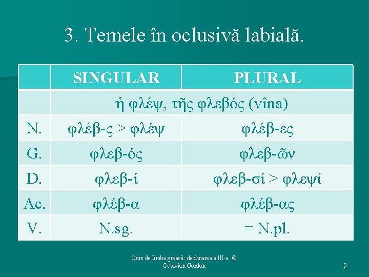 3. Temele în oclusivă – caracteristici. Ø Majoritatea MF – sigmatice (au ς la N. sg. ). Ø În contact cu -ς / -σι (Ν. sg. / D. pl. ), oclusivele suferă aceleaşi transformări pe care le-am văzut la indicativul viitor / aorist. ØLabială + ς > πς, notată ψ. ØGuturală + ς > κς, notată ξ. ØDentală + ς > σσ > σ. Curs de limba greacă: declinarea a III-a. © Octavian Gordon 8