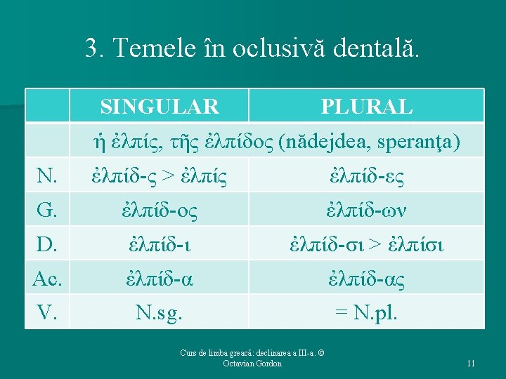 4. Temele în -ντ – caracteristici. Ø Există cîteva substantive animate în -οντ, care nu au la N. sg. lungire morfologică, ci marca ς. În aceste cazuri, grupul -ντ- cade şi la N. sg. , producîndu-se aceeaşi lungire compensatorie. Ø ὀδοντ-ς > ὀδοῦς (dinte) ØG. sg. : ὀδόντ-ος. ØD. pl. : ὀδόντ-σι > ὀδοῦσι. Curs de limba greacă: declinarea a III-a. © Octavian Gordon 15