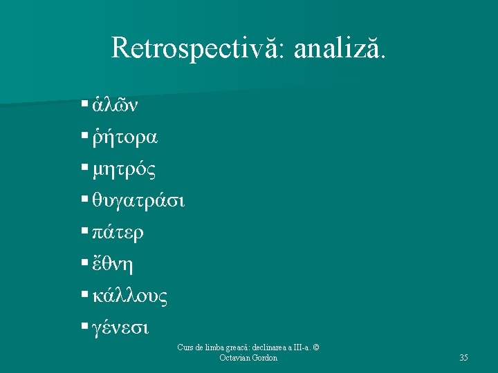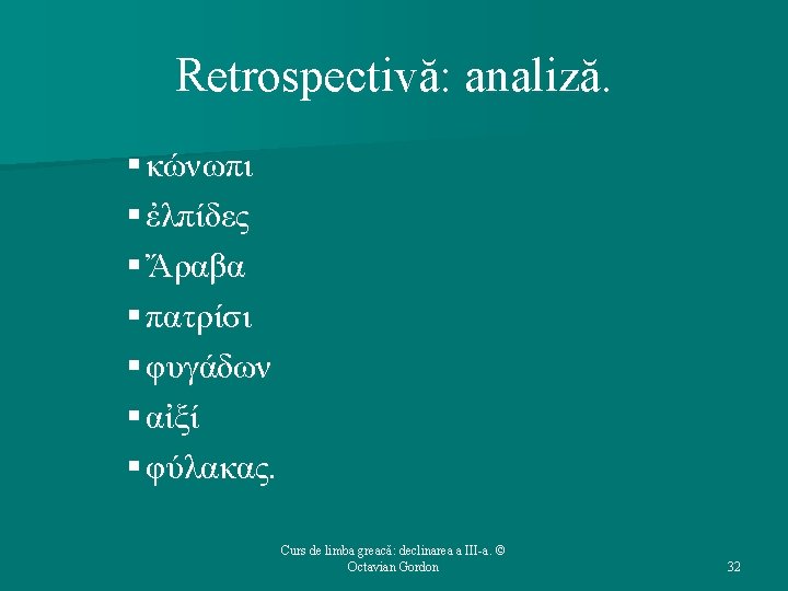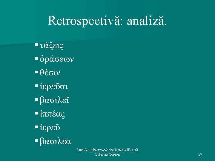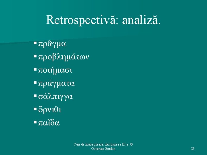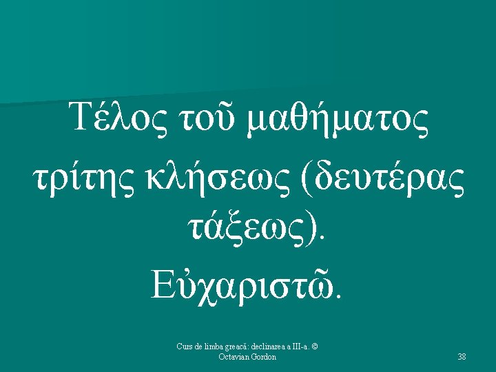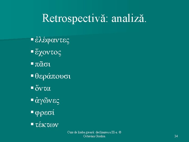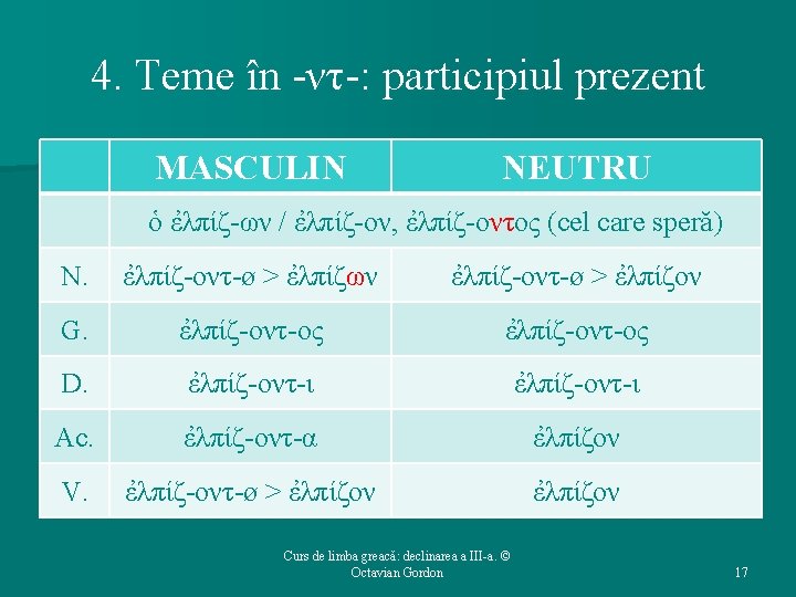 Structura cursului (1): 1. 2. 3. 4. 5. Repere bibliografice. Declinarea a III-a: generalităţi. Temele în oclusivă. Temele în -ντ-. Temele în -ν-. Curs de limba greacă: declinarea a III-a. © Octavian Gordon 2