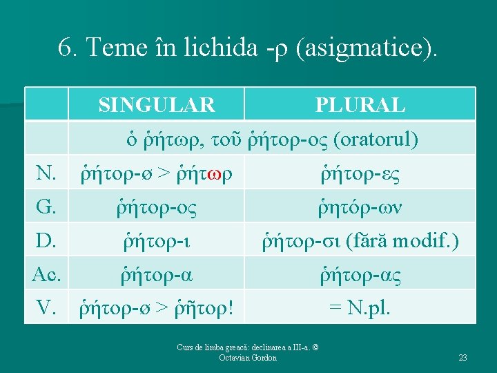 6. Teme în lichida -λ-. SINGULAR PLURAL ὁ / ἡ ἅλς, τοῦ / τῆς ἁλός (sarea / marea) Ν. ἅλ-ς ἅλ-ες G. ἁλ-ός ἁλ-ῶν D. ἁλ-ί ἁλ-σί Ac. ἅλ-ας V. = N. sg. = N. pl. Curs de limba greacă: declinarea a III-a. © Octavian Gordon 22