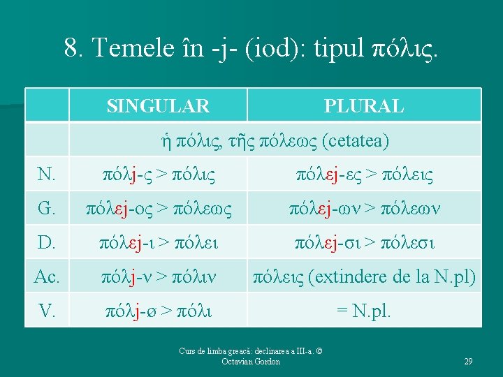 8. Temele în -j-: tipul πόλις. Ø Substantive feminine cu alternanţă j (N. Ac. V. sg) / ej (restul cazurilor). Ø Σ este marca (de animat) a N. sg. Ø La G. sg. se petrece o metateză a cantităţii (cantitatea lungă trece asupra desinenţei -ος) Ø j (iod) cade între două vocale, iar vocalele rămase în contact se contrag. Curs de limba greacă: declinarea a III-a. © Octavian Gordon 28