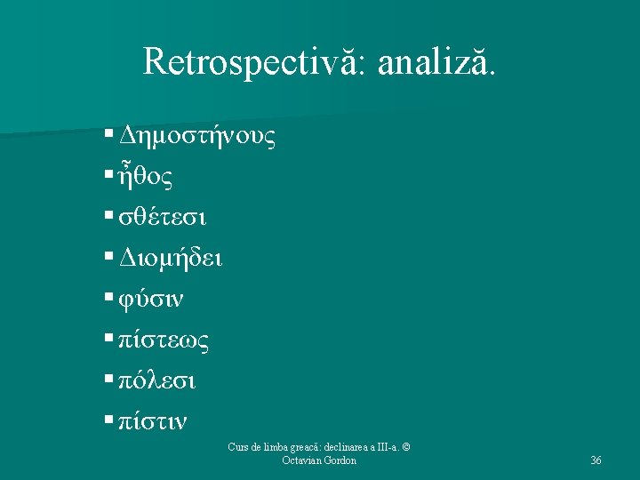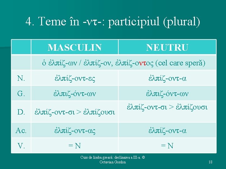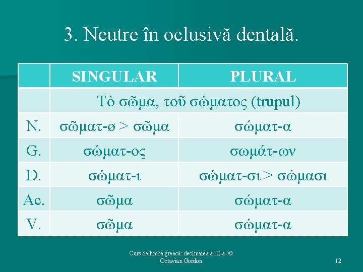 Structura cursului (1): 1. 2. 3. 4. 5. Repere bibliografice. Declinarea a III-a: generalităţi. Temele în oclusivă. Temele în -ντ-. Temele în -ν-. Curs de limba greacă: declinarea a III-a. © Octavian Gordon 2