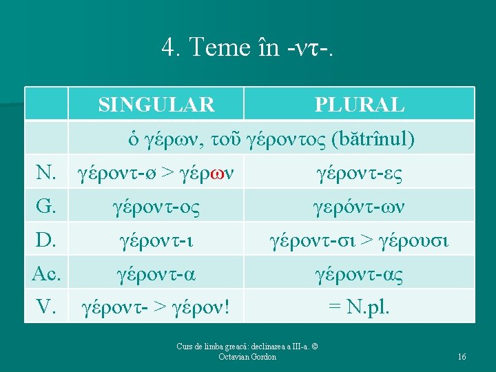 4. Temele în -ντ – caracteristici. Ø Există cîteva substantive animate în -οντ, care nu au la N. sg. lungire morfologică, ci marca ς. În aceste cazuri, grupul -ντ- cade şi la N. sg. , producîndu-se aceeaşi lungire compensatorie. Ø ὀδοντ-ς > ὀδοῦς (dinte) ØG. sg. : ὀδόντ-ος. ØD. pl. : ὀδόντ-σι > ὀδοῦσι. Curs de limba greacă: declinarea a III-a. © Octavian Gordon 15