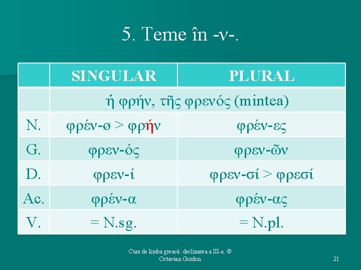 5. Temele în -ν: caracteristici. Ø Majoritatea sînt asigmatice, deci au la N. sg. lungire morfologică. Ø Acest lucru generează alternanţa lung / scurt între N. sg. şi celelalte cazuri. Ø Există şi situaţii în care vocala lungă de la N. sg. s-a extins la toată paradigma: Ø αἰών, αἰῶν-ος (veac); Ø πευθήν, πευθῆν-ος (spion). Curs de limba greacă: declinarea a III-a. © Octavian Gordon 20