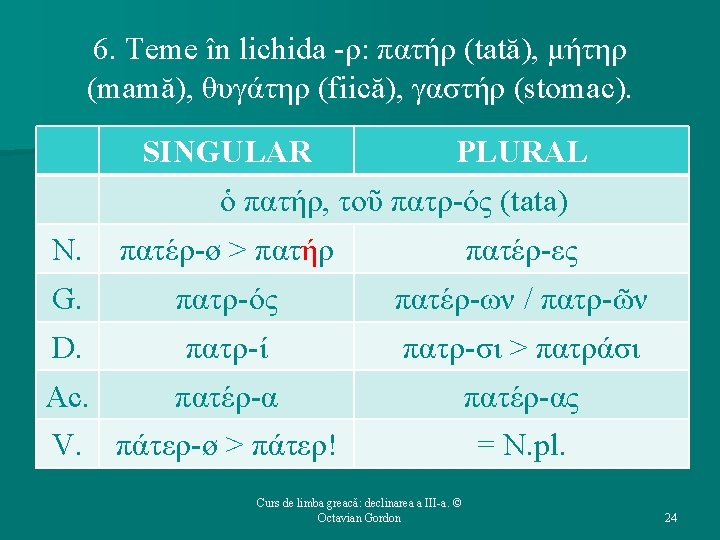 Structura cursului (2): Temele în lichidă (λ, ρ). 7. Temele în -σ-. 8. Temele în -j-: tipul πόλις. 9. Temele în -ηϝ-: tipul βασιλεύς. 6. Curs de limba greacă: declinarea a III-a. © Octavian Gordon 3