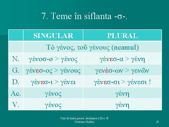 7. Temele în -σ-: caracteristici. Ø A nu se confunda cu substantivele sigmatice (cele care au marca ς la N. sg. )! Ø Majoritatea sînt neutre. Ø Neutrele prezintă alternanţa vocalică o / e în silaba predesinenţială, la N. sg. (şi, implicit, Ac. sg şi V. sg. ) faţă de restul cazurilor. Ø Σῖγμα cade între două vocale, generînd contragerea celor două vocale rămase în contact, după regulile generale contragerilor. Curs de limba greacă: declinarea a III-a. © Octavian Gordon 25