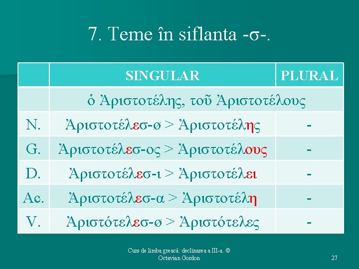 2. Generalităţi: accentuarea. Ø Accentul tinde să se menţină pe silaba de la N. sg. , dacă vocalismul final o permite. Ø Monosilabicele au accentul pe finală la G. şi D. , atît sg. , cît şi pl. Curs de limba greacă: declinarea a III-a. © Octavian Gordon 6