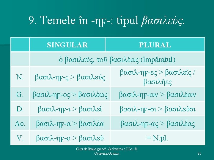 9. Temele în -ηϝ-: tipul βασιλεύς. Ø Ϝ (digamma) intervocalic cade, iar vocalele rămase în hiat nu se contrag decît dacă rezultatul contragerii este e. Ø Σ este marca (de animat) a N. sg. Ø Au loc numeroase transformări fonetice, aşa încît se ajunge la următoarea paradigmă: Curs de limba greacă: declinarea a III-a. © Octavian Gordon 30