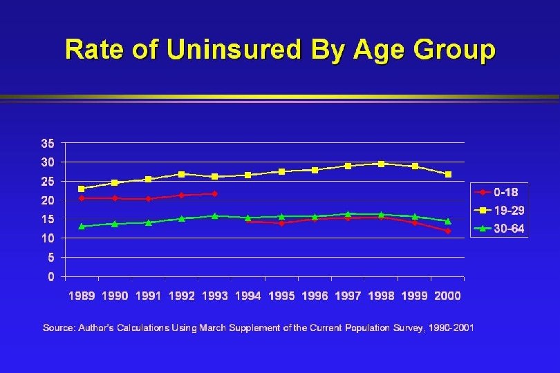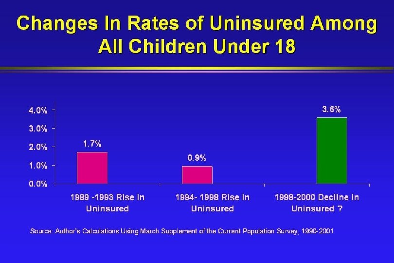 A Few Words of Caution ¨ Data before and after 1994 are not directly comparable because of a change in the ordering of CPS questions that dramatically increased reporting of private insurance among children. ¨ Data before and after 1999 are not directly comparable due to a change in the composition of CPS questions that dramatically increased reporting of private health insurance among children. Thus the apparent rise in insurance in the following diagrams in 1999 and 2000 is largely or entirely due to coding changes.
