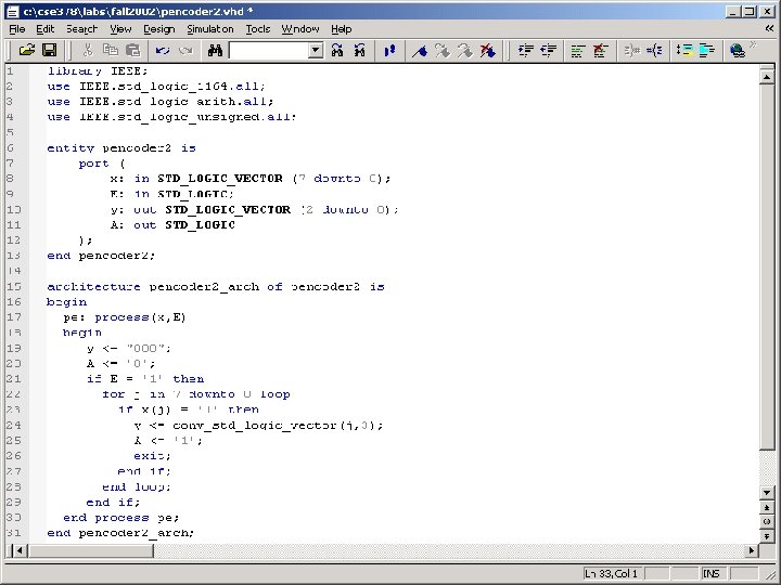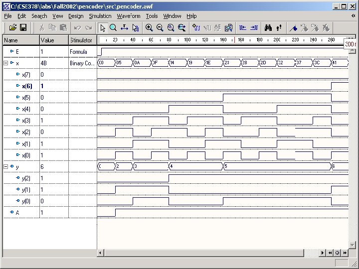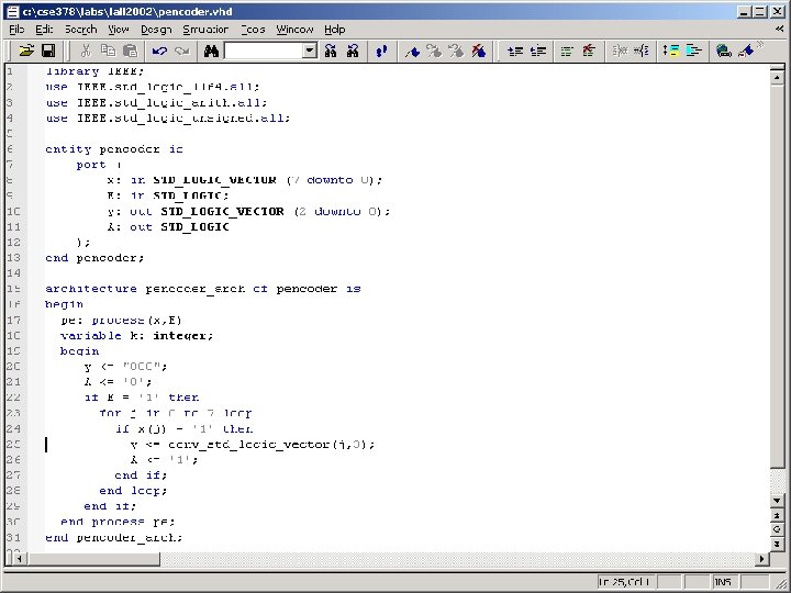 architecture pencoder_arch of pencoder is begin pe: process(x, E) variable k: integer; begin y <= "000"; A <= '0'; if E = '1' then for j in 0 to 7 loop if x(j) = '1' then y <= conv_std_logic_vector(j, 3); A <= '1'; end if; end loop; end if; end process pe; end pencoder_arch;