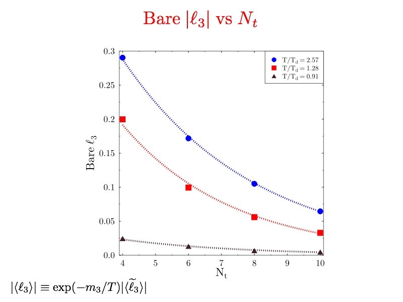 Bare triplet loop vs T, at different Nt Note scale=> ~. 3 Nt=4 Nt = # time steps. Nt=6 Triplet loop↑ Bare loop vanishes as Nt →∞ Nt=8 Nt=10 Tc T/Tc=>
