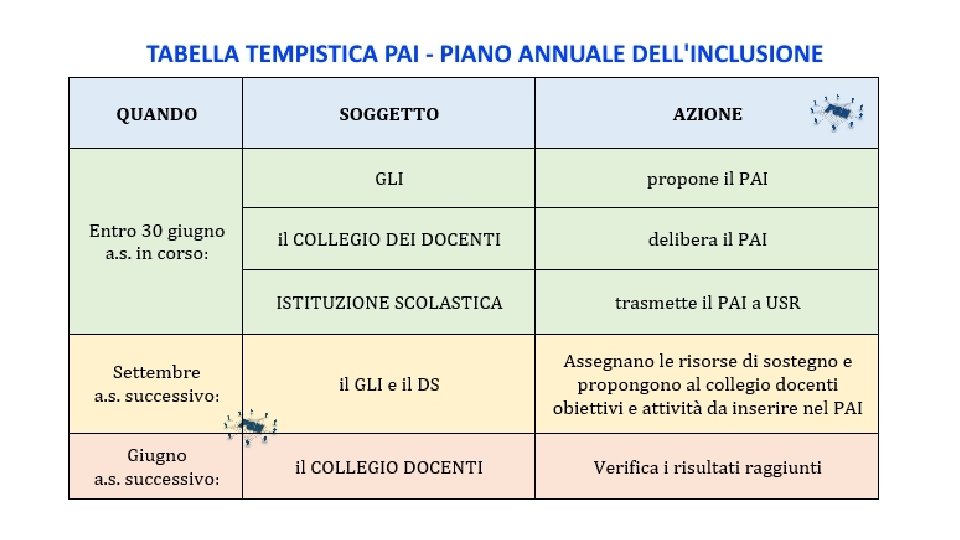 Il PAI –Piano Annuale per l’inclusione • introdotto dalla direttiva sui BES del 27/12/12 e dalla circolare ministeriale del 6/03/13 "Strumenti d’intervento per alunni con bisogni educativi speciali e organizzazione territoriale per l’inclusione scolastica – Indicazioni operative", è un documento che “fotografa” lo stato dei bisogni educativi /formativi della scuola e le azioni che si intende attivare per fornire delle risposte adeguate. Ciascuna istituzione scolastica, nell’ambito della definizione del PTOF, predispone il Piano per l’inclusione che definisce le modalità per l’utilizzo coordinato delle risorse, compresi il superamento delle barriere e l’individuazione dei facilitatori del contesto di riferimento nonché per progettare e programmare gli interventi di miglioramento della qualità dell’inclusione scolastica.