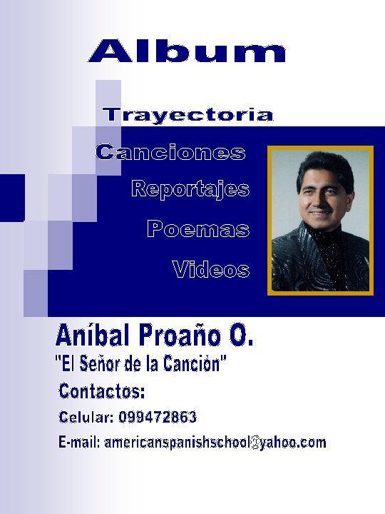 TRAYECTORIA Aníbal Proaño Osorio: Artista desde niño Su vida: Aníbal Proaño, conocido también como “El Señor de la Canción”, es un Artista quiteño para la quien la música y el canto han sido su mayor afición desde que era pequeño. Desde niño Aníbal Proaño tuvo una inclinación por la música, el canto y la poesía. Ya en su adolescencia formó junto a sus compañeros del colegio su primer grupo folklórico y actuó en diferentes eventos artísticos de la institución, En 1979, Aníbal comienza a escribir canciones para luego interpretarlas en su guitarra y voz. En 1980 integró el Grupo Folklórico “Intiyana” en Shushufindi donde participó como guitarrista y cantante. Al mismo tiempo Aníbal ejercía su profesión de profesor primario para luego trasladarse a El Coca donde además de profesor de inglés y música enseñó a sus estudiantes a tocar la quena, guitarra, charango y zampoñas y organizó los grupos folklóricos estudiantil y de profesores, respectivamente en el Colegio Padre Miguel Gamboa y un grupo folklórico en la Brigada de Selva 19 Napo. En 1990, en la ciudad de Quito forma parte del Dúo “Voces del Alma” y para 1993, como solista lanza su primer acetato “No Volveré”. En el 2001 lanza su primer CD “Las Canciones más lindas de América” que incluye boleros, pasillos, valses, rancheras y cumbias con algunos temas de su autoría. En enero del 2002 sale su segundo CD “Canciones que Nacen del Alma” igualmente con varios temas de su autoría. En el 2005 graba su tercer CD “Amor Infinito” , en el 2006 su cuarto volumen titulado Unamuncho y en el 2008 su quinto volumen “Puro sentimiento” con temas Inéditos de su propia autoría. Como poeta ha publicado dos libros junto a otros compañeros del Centro Internacional de Estudios Poéticos y ha obtenido el segundo y tercer puesto en concursos de poesía a nivel nacional. Aníbal Proaño Osorio, canta autor, compositor y poeta continua entregando su mensaje a través de sus canciones