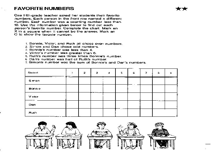 Candy, Candy Mark X in the box where Jake and lollipops meet. Now you can see that there’s only one space left next to Tina’s name— lollipops. Mark that Yes. And there’s only one space left next to Jake’s name– chocolate bars. Mark that box Yes. Choc. Bars Taffy Lollipops Tina X X Yes Kathy X Yes X Jake Yes X X