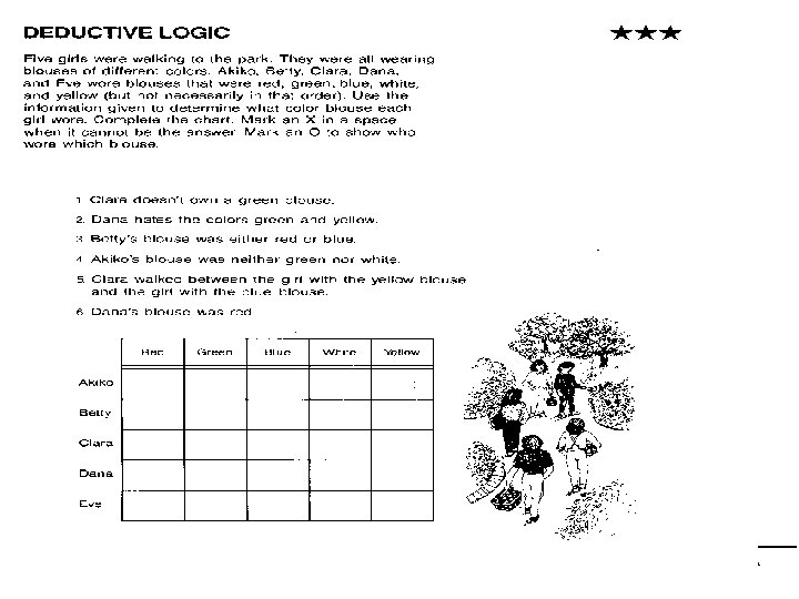 Flowers Karen, Derek, Fay, Tanya, and Scott each have a special favorite flower. No two of them have the same favorite. Which person matches which flower? 1. 2. 3. 4. 5. 6. Karen’s favorite is not the tulip. Derek hates tulips and roses. Someone really likes daisies. Fay likes violets. Tanya is allergic to carnations. Scott likes the flower to which Tanya is allergic