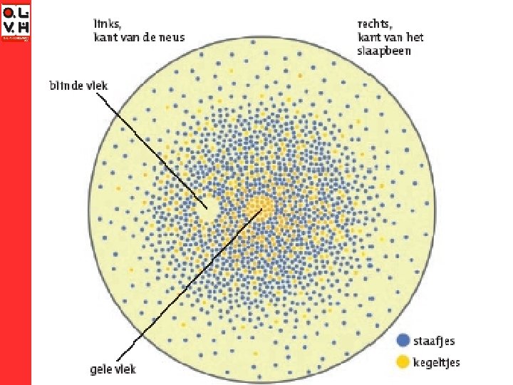 Gele vlek • alleen kegeltjes • gebied waarmee men de kleinste details kan waarnemen • Functioneert niet in het donker