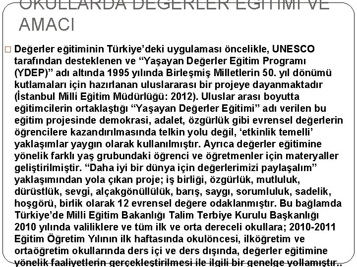 OKULLARDA DEĞERLER EĞİTİMİ VE AMACI � Değerler eğitiminin Türkiye’deki uygulaması öncelikle, UNESCO tarafından desteklenen ve “Yaşayan Değerler Eğitim Programı (YDEP)” adı altında 1995 yılında Birleşmiş Milletlerin 50. yıl dönümü kutlamaları için hazırlanan uluslararası bir projeye dayanmaktadır (İstanbul Milli Eğitim Müdürlüğü: 2012). Uluslar arası boyutta eğitimcilerin ortaklaştığı “Yaşayan Değerler Eğitimi” adı verilen bu eğitim projesinde demokrasi, adalet, özgürlük gibi evrensel değerlerin öğrencilere kazandırılmasında telkin yolu değil, ‘etkinlik temelli’ yaklaşımlar yaygın olarak kullanılmıştır. Ayrıca değerler eğitimine yönelik farklı yaş grubundaki öğrenci ve öğretmenler için materyaller geliştirilmiştir. “Daha iyi bir dünya için değerlerimizi paylaşalım” yaklaşımından yola çıkan proje; iş birliği, özgürlük, mutluluk, dürüstlük, sevgi, alçakgönüllülük, barış, saygı, sorumluluk, sadelik, hoşgörü, birlik olarak 12 evrensel değere odaklanmıştır. Bu bağlamda Türkiye’de Milli Eğitim Bakanlığı Talim Terbiye Kurulu Başkanlığı 2010 yılında valiliklere ve tüm ilk ve orta dereceli okullara; 2010 -2011 Eğitim Öğretim Yılının ilk haftasında okulöncesi, ilköğretim ve ortaöğretim okullarında ders içi ve ders dışında, değerler eğitimine yönelik faaliyetlerin gerçekleştirilmesi ile ilgili bir genelge yollamıştır. .
