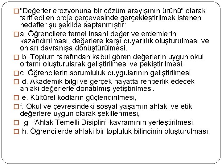 � “Değerler erozyonuna bir çözüm arayışının ürünü” olarak tarif edilen proje çerçevesinde gerçekleştirilmek istenen hedefler şu şekilde saptanmıştır: � a. Öğrencilere temel insanî değer ve erdemlerin kazandırılması, değerlere karşı duyarlılık oluşturulması ve onları davranışa dönüştürülmesi, � b. Toplum tarafından kabul gören değerlerin uygun okul ortamı oluşturularak geliştirilmesi ve pekiştirilmesi. � c. Öğrencilerin sorumluluk duygularının geliştirilmesi. � d. Akademik bilgi ve gerçek hayatta rehberlik edecek ahlaki değerlerle donatılmış yetiştirilmesi. � e. Kültürel kodların güçlendirilmesi, � f. Okul ve çevresindeki sosyal yaşamın ahlaki ve etik değerlere uygun olarak şekillenmesi, � g. “Ahlak Temelli Disiplin” kavramının yerleştirilmesi. � h. Öğrencilerde ahlaki bir topluluk bilincinin oluşturulması.