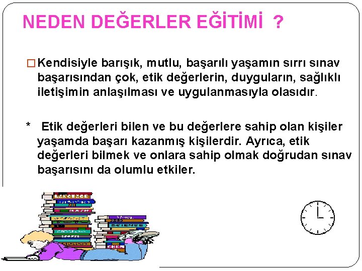 NEDEN DEĞERLER EĞİTİMİ ? � Kendisiyle barışık, mutlu, başarılı yaşamın sırrı sınav başarısından çok, etik değerlerin, duyguların, sağlıklı iletişimin anlaşılması ve uygulanmasıyla olasıdır. * Etik değerleri bilen ve bu değerlere sahip olan kişiler yaşamda başarı kazanmış kişilerdir. Ayrıca, etik değerleri bilmek ve onlara sahip olmak doğrudan sınav başarısını da olumlu etkiler.