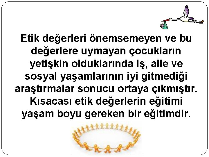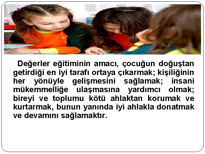� Erken çocukluk döneminde değerlerin kazandırılması çok önemlidir. � Bunu kazandıracak birim ise, ailedir. Ancak, çocuğun annebabasının yanında geçirdiği sürenin gittikçe azalması, boşanma olaylarının günümüz toplumunda yüksek oluşu, yoksulluk gibi belli başlı toplumsal nedenler ailenin değerler eğitiminde yetersiz kalmasına yol açmıştır.