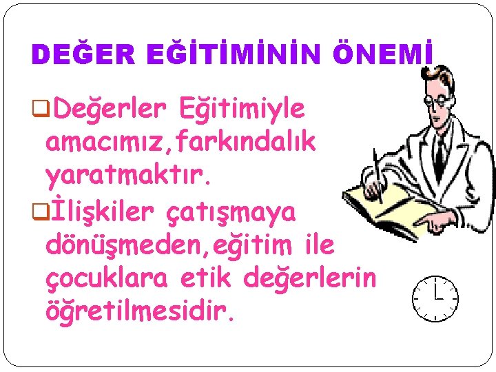DEĞER EĞİTİMİNİN ÖNEMİ q. Değerler Eğitimiyle amacımız, farkındalık yaratmaktır. qİlişkiler çatışmaya dönüşmeden, eğitim ile çocuklara etik değerlerin öğretilmesidir.