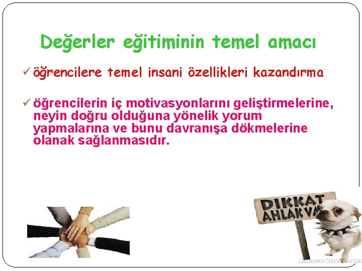 Değerler eğitiminin temel amacı ü öğrencilere temel insani özellikleri kazandırma ü öğrencilerin iç motivasyonlarını geliştirmelerine, neyin doğru olduğuna yönelik yorum yapmalarına ve bunu davranışa dökmelerine olanak sağlanmasıdır.