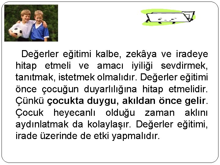 Değerler eğitimi kalbe, zekâya ve iradeye hitap etmeli ve amacı iyiliği sevdirmek, tanıtmak, istetmek olmalıdır. Değerler eğitimi önce çocuğun duyarlılığına hitap etmelidir. Çünkü çocukta duygu, akıldan önce gelir. Çocuk heyecanlı olduğu zaman aklını aydınlatmak da kolaylaşır. Değerler eğitimi, irade üzerinde de etki yapmalıdır.