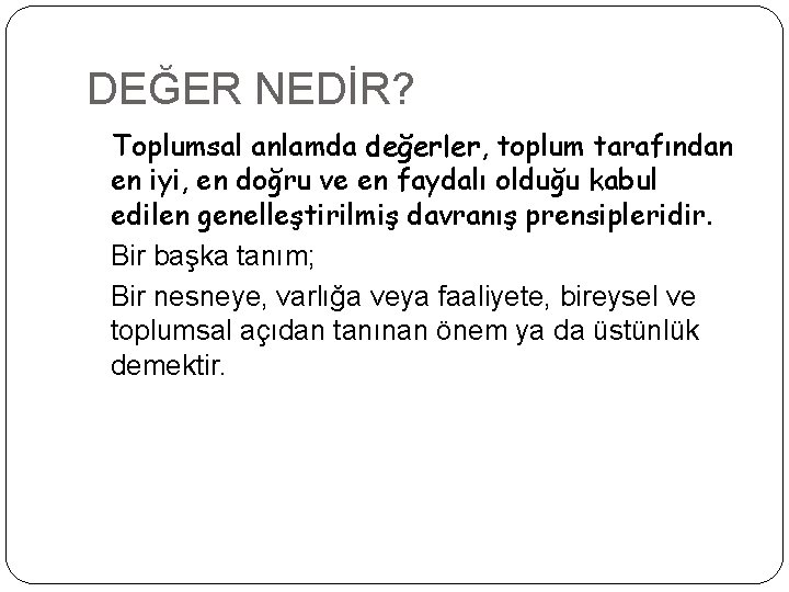 DEĞER NEDİR? Toplumsal anlamda değerler, toplum tarafından en iyi, en doğru ve en faydalı olduğu kabul edilen genelleştirilmiş davranış prensipleridir. Bir başka tanım; Bir nesneye, varlığa veya faaliyete, bireysel ve toplumsal açıdan tanınan önem ya da üstünlük demektir.