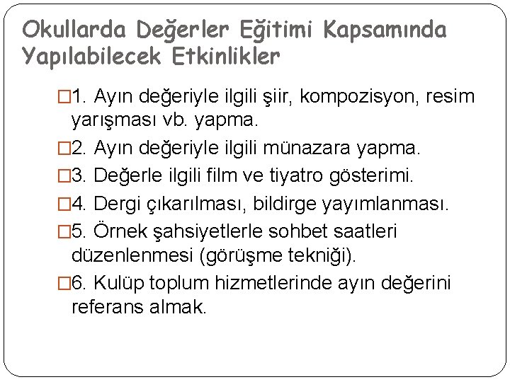 Okullarda Değerler Eğitimi Kapsamında Yapılabilecek Etkinlikler � 1. Ayın değeriyle ilgili şiir, kompozisyon, resim yarışması vb. yapma. � 2. Ayın değeriyle ilgili münazara yapma. � 3. Değerle ilgili film ve tiyatro gösterimi. � 4. Dergi çıkarılması, bildirge yayımlanması. � 5. Örnek şahsiyetlerle sohbet saatleri düzenlenmesi (görüşme tekniği). � 6. Kulüp toplum hizmetlerinde ayın değerini referans almak.