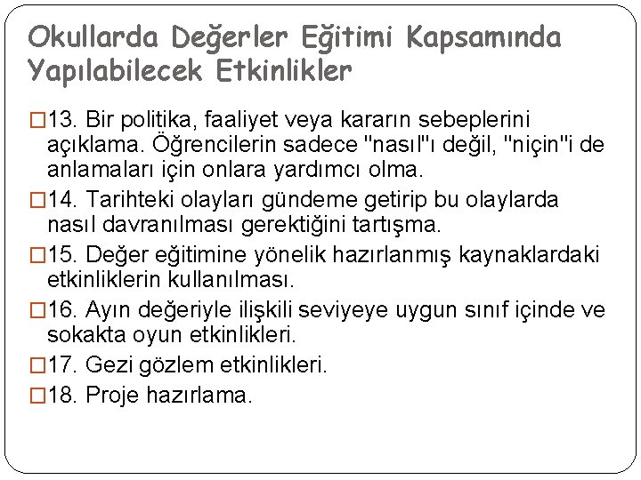 Okullarda Değerler Eğitimi Kapsamında Yapılabilecek Etkinlikler � 13. Bir politika, faaliyet veya kararın sebeplerini açıklama. Öğrencilerin sadece "nasıl"ı değil, "niçin"i de anlamaları için onlara yardımcı olma. � 14. Tarihteki olayları gündeme getirip bu olaylarda nasıl davranılması gerektiğini tartışma. � 15. Değer eğitimine yönelik hazırlanmış kaynaklardaki etkinliklerin kullanılması. � 16. Ayın değeriyle ilişkili seviyeye uygun sınıf içinde ve sokakta oyun etkinlikleri. � 17. Gezi gözlem etkinlikleri. � 18. Proje hazırlama.