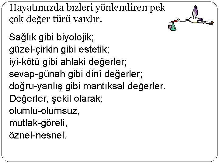 Değerler eğitimi Øbireyin kendini tanımasını, kendi ile uyum içinde olmasını, düşünüş ve hareketlerinde tutarlı olmasını sağlayan özelliklerin kazandırılması için öğrenme ortamlarının yaratılmasıdır.