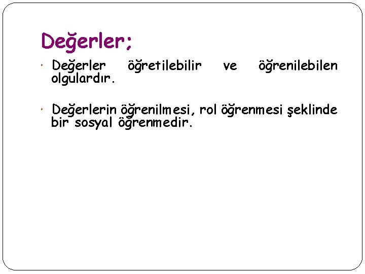 Değerler; Değerler olgulardır. öğretilebilir ve öğrenilebilen Değerlerin öğrenilmesi, rol öğrenmesi şeklinde bir sosyal öğrenmedir.