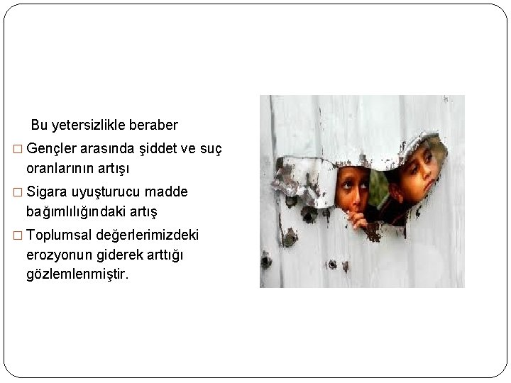 Bu yetersizlikle beraber � Gençler arasında şiddet ve suç oranlarının artışı � Sigara uyuşturucu madde bağımlılığındaki artış � Toplumsal değerlerimizdeki erozyonun giderek arttığı gözlemlenmiştir.