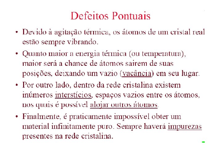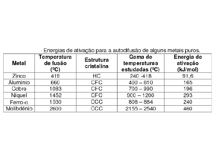 • Difusão por lacuna: tanto a autodifusão como a interdifusão ocorrem por este mecanismo; • Ao aumentar a temperatura aumenta o número de lacunas; • Difusão intersticial: difusão de impurezas intersticiais, átomos muito pequeno, como H, C, N, O; • Átomos de impurezas ou hospedeiros substicionais raramente se difundem por este mecanismo;