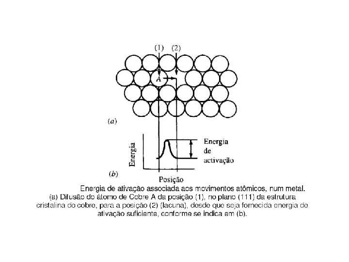 • De uma perspectiva atômica difusão é a migração em etapas de átomos de um sítio ao outro do reticulado cristalino. • Os átomos em materiais sólidos estão em movimento constante • Para o átomo se movimentar é preciso: • deve existir um sítio adjacente vazio; • o átomo deve possuir energia suficiente para quebrar as ligações atômicas e causar alguma distorção na rede cristalina durante deslocamento • Essa energia é de natureza vibracional e aumenta com aumento da temperatura; • Nos metais os átomos se movimento de 2 maneiras: por lacuna ou por difusão intersticial.