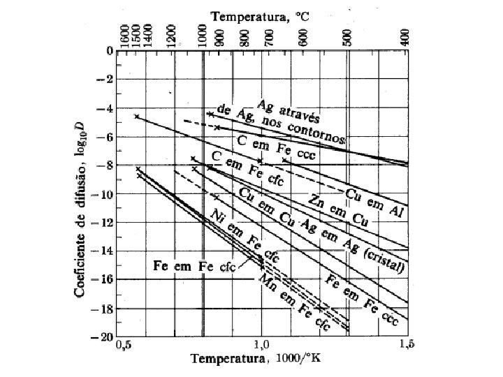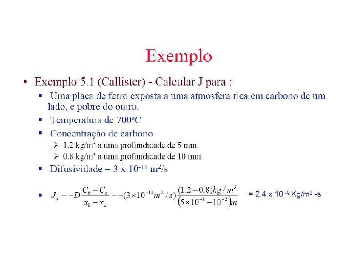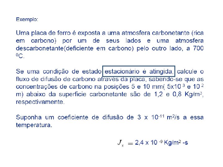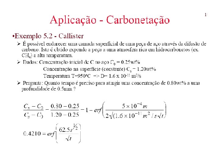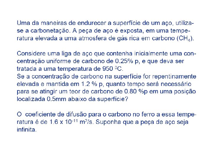 Outro exemplo de carbonetação: • Sample Problem: An FCC iron-carbon alloy initially containing 0. 20 wt% C is carburized at an elevated temperature and in an atmosphere that gives a surface carbon concentration constant at 1. 0 wt%. If after 49. 5 h the concentration of carbon is 0. 35 wt% at a position 4. 0 mm below the surface, determine the temperature at which the treatment was carried out. Use: