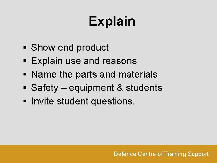 Explain § § § Show end product Explain use and reasons Name the parts and materials Safety – equipment & students Invite student questions. Defence Centre of Training Support