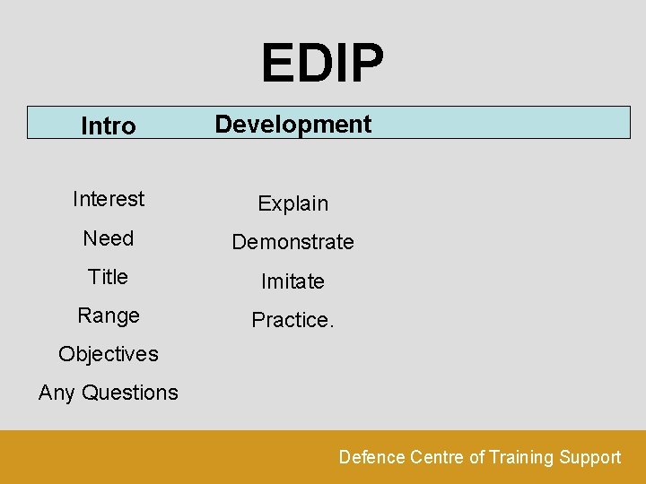 EDIP Intro Development Interest Explain Need Demonstrate Title Imitate Range Practice. Objectives Any Questions Defence Centre of Training Support