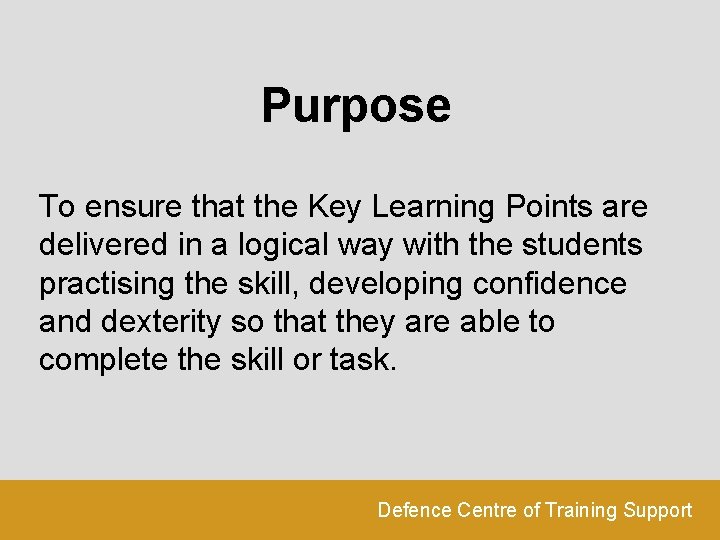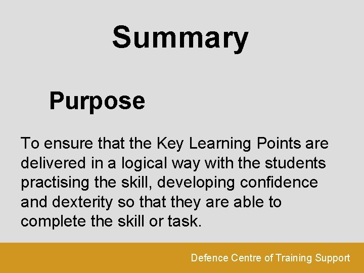 Summary Purpose To ensure that the Key Learning Points are delivered in a logical way with the students practising the skill, developing confidence and dexterity so that they are able to complete the skill or task. Defence Centre of Training Support