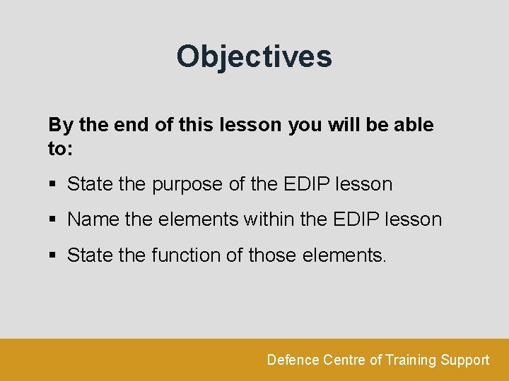 Objectives By the end of this lesson you will be able to: § State the purpose of the EDIP lesson § Name the elements within the EDIP lesson § State the function of those elements. Defence Centre of Training Support