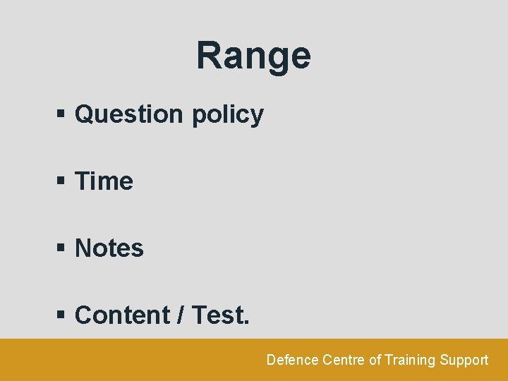 Range § Question policy § Time § Notes § Content / Test. Defence Centre of Training Support