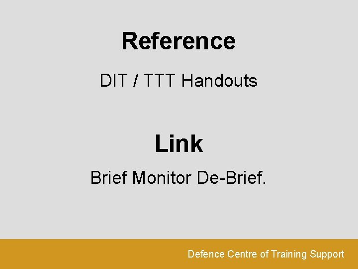 Reference DIT / TTT Handouts Link Brief Monitor De-Brief. Defence Centre of Training Support
