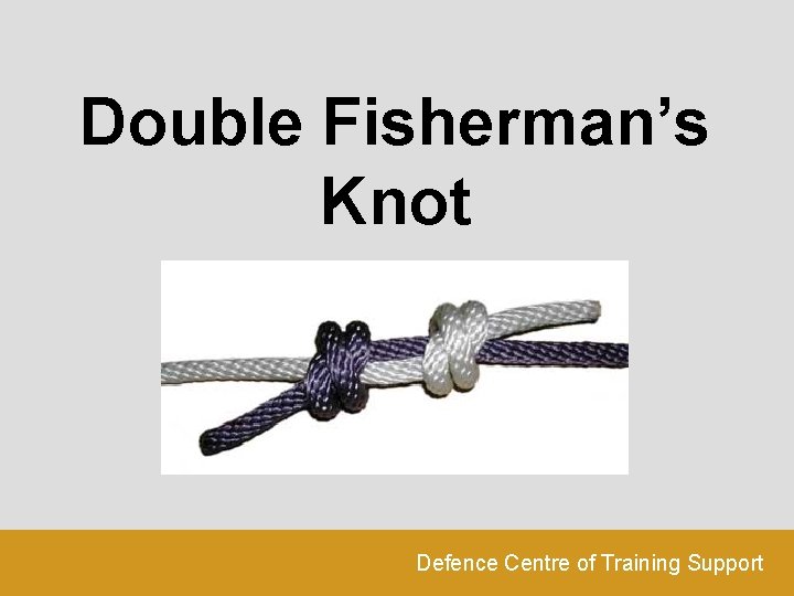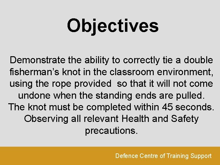 Objectives Demonstrate the ability to correctly tie a double fisherman’s knot in the classroom environment, using the rope provided so that it will not come undone when the standing ends are pulled. The knot must be completed within 45 seconds. Observing all relevant Health and Safety precautions. Defence Centre of Training Support