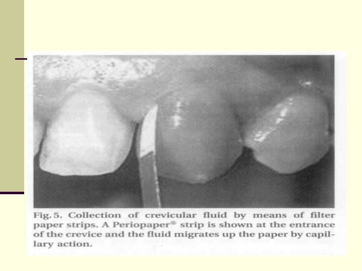 Weighing The Strip n This method involves the weighing of strips before and after sample collection. n This is a successful method but requires a very sensitive balance to estimate the very small amounts of fluid which may be collected from a healthy crevice. n Weinstein et al. (1967) use preweighed twisted thread into the gingival crevice around the tooth and determined the amount of fluid collected.