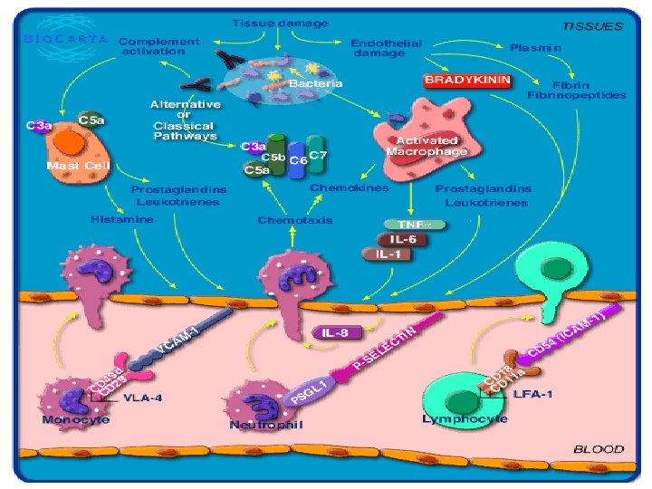 Inflammatory Responses • • • Activated macrophages also produce cytokines and other mediators to trigger inflammatory responses. Inflammation can also be triggered by the Complement Cascade. Inflammation is traditionally defined by 4 Latin words, rubor, calor, tumor and dolor, meaning redness, heat, swelling and pain. Inflammation plays three essential roles in combating infection: 1. deliver additional effector molecules and cells to sites of infection to augment the killing of invading microorganisms by the front-line macrophages, 2. provide a physical barrier preventing the spread of infection, and 3. promote the repair of injured tissue. Reflects 3 types of changes in the local blood vessel: 1. an increase in vascular diameter, leading to increased local blood flow and a reduction in the velocity of blood flow, 2. endothelial cells lining the blood vessel are activated to express adhesion molecules that promote the binding of circulating leukocytes, and 3. increase in vascular permeability of local blood vessels, leading to exit of fluid and protein from the blood and their accumulation in the tissues.