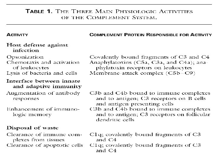 The Complement System • • The complement system is a set of plasma proteins that act together to attack extracellular forms of pathogens. It was first discovered as an effector arm of the antibody response, but complement can also be activated early in infection in the absence of antibodies; complement first evolved as part of the innate immune system. Activation of complement involves the sequential proteolysis of proteins to generate enzymes with proteolytic activity. The products of complement activation become covalently attached to microbial cell surfaces or to Ab bound to microbes and to other antigens. Complement activation is inhibited by regulatory proteins that are present on normal host cells and absent from microbes. There are three pathways of complement activation: – the classical pathway, which is triggered by antibody or by direct binding of complement component C 1 q to the pathogen surface; – the MB-lectin pathway, which is triggered by mannan-binding lectin, a normal serum constituent that binds some encapsulated bacteria; and – the alternative pathway, which is triggered directly on pathogen surfaces. The 3 pathways converge at the point of cleavage of C 3.