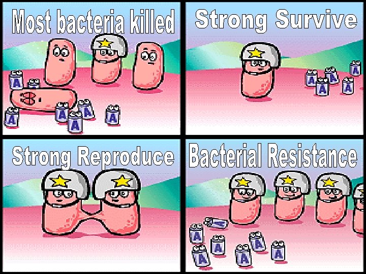 • Constant creation of chemicals for human use is eliminating the “unfit” (invading)organisms – Ex: Antibiotics eliminating unfit bacteria – Ex: Pesticides eliminating unfit pests – Ex: Antivirals… – Ex: Fungicides… • Allows resistant to survive and reproduce